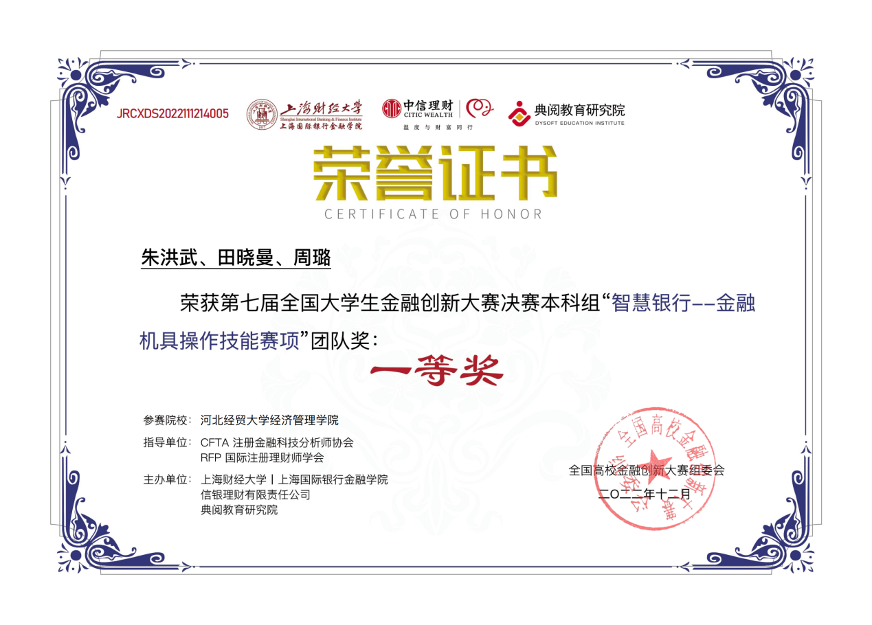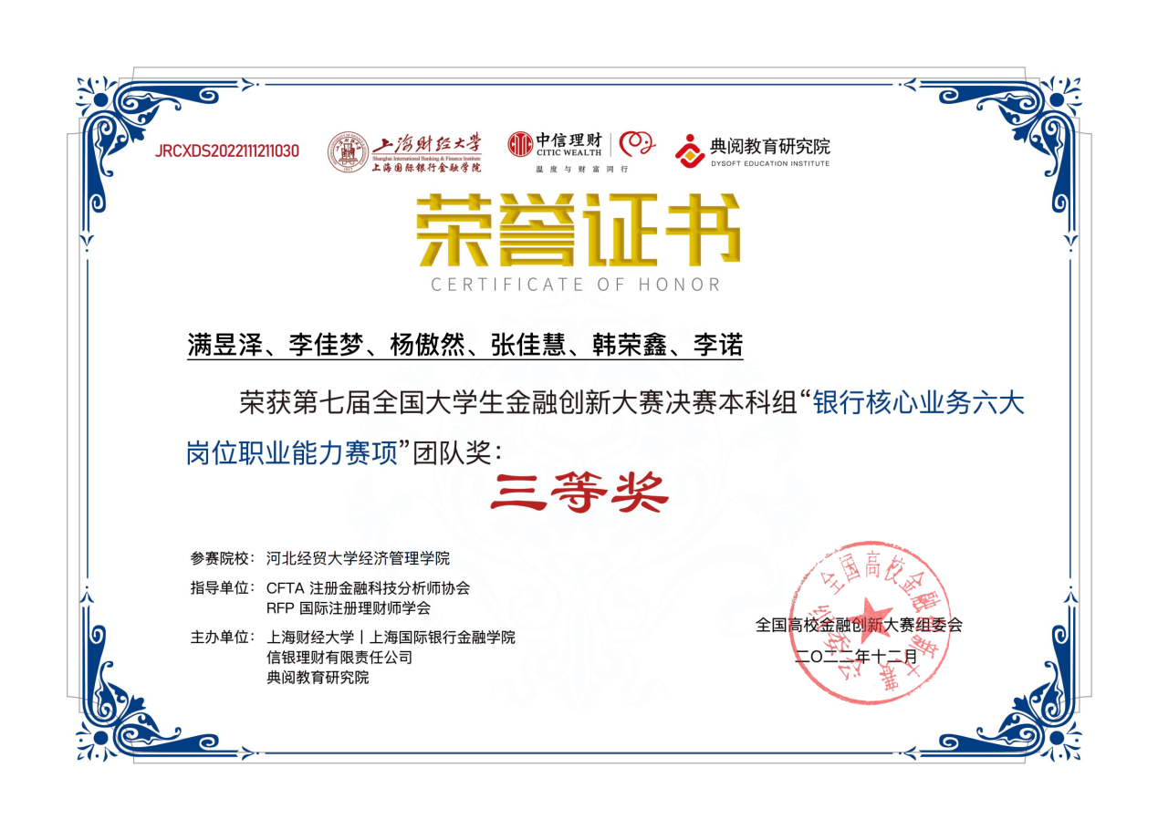 202211月由上海财经大学、上海国际银行金融学院、中信集团-信银理财、典阅教育研究院主办的第七届全国大学生金融创新大赛圆满落幕。taptap点点经济系首次组队参赛,周璐、朱洪武、田晓曼同学荣获智慧银行银行-金融机具操作技能赛项团体一等奖、满昱泽、李佳梦、杨傲然、韩荣鑫、李诺、张佳慧荣获银行核心业务六大岗位职业能力赛项团体三等奖。郑庆国、贾红玉老师被评选为优秀指导老师。