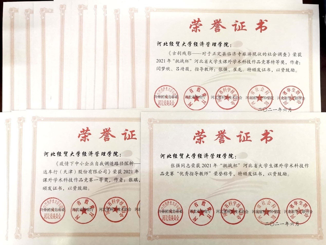 本届大赛自今年二月份启动以来,通过校内层层选拔,经过大赛评审委员会的初评、复评,以及终审答辩,taptap点点报送的作品在全省1642件作品中脱颖而出,共有16项获奖。其中,《古刹残影—对于正定县临济寺旅游现状的社会调查》获得特等奖。《疫情下中小企业自我调适路径探析———阿里巴巴国家站与易路达车行(天津)股份有限公司》等3个项目获得一等奖,《本科生学业“增负”的必要性以及策略研究——以河北省高校为例》获得二等奖,《短视频等自媒体文化的思考》等11个项目获得三等奖。这些奖项的获得充分展示了taptap点点人才培养水平。taptap点点团委全面、高效、系统的组织工作也受到了赛事组委会的充分认可,最终被授予“优秀组织单位奖”。taptap点点教师张强还获得“优秀指导教师”荣誉称号。