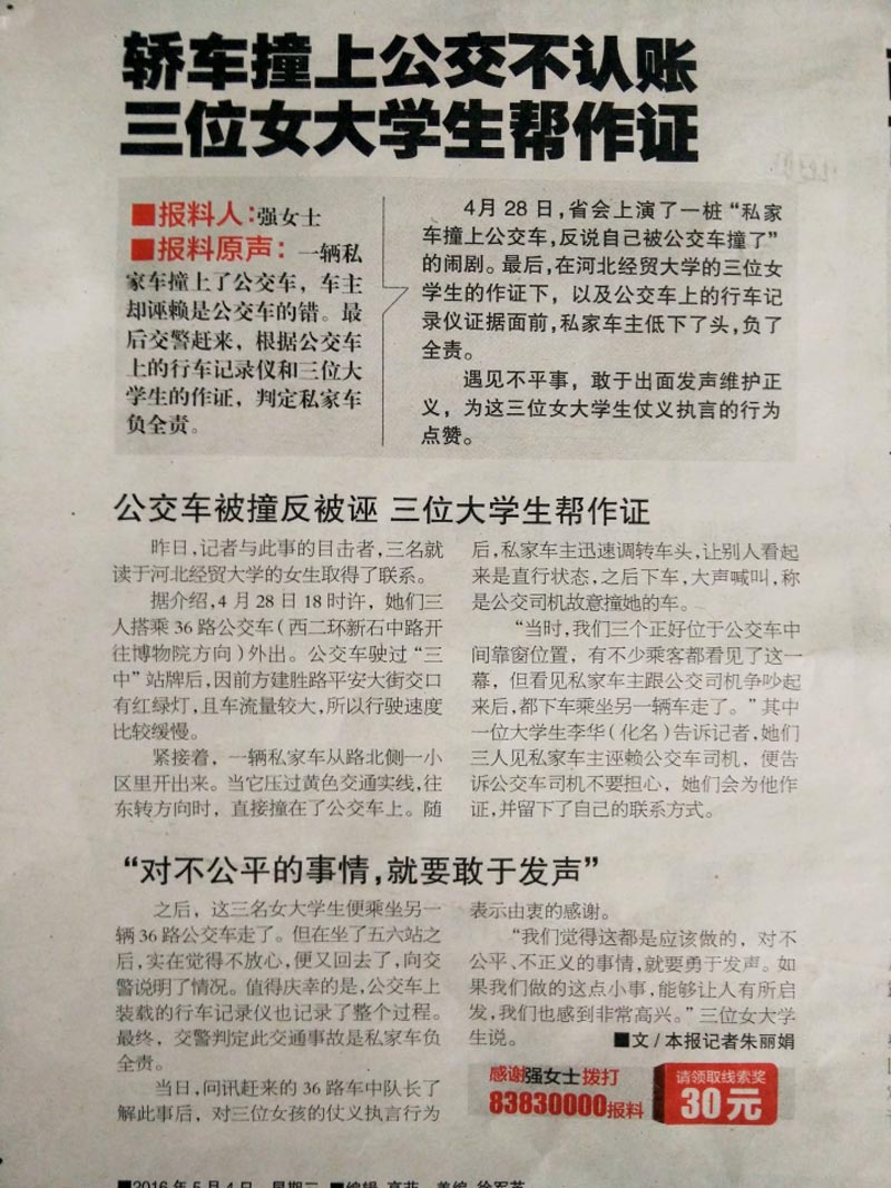 5月4日,青年节之际,taptap点点三位大学生为维护正义仗义执言的先进事迹登上《河北青年报》,经了解得知,原来是4月28日,一辆私家车撞上公交车后反诬是公交车的错,taptap点点管理系学生刘家畅、张新竹、王玉宁恰好目睹了这一幕,她们出手相助,还公交车司机以清白。学院党委决定对她们的行为予以表彰。