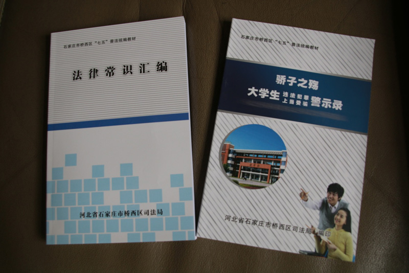 表志勇介绍说,这次带来的普法读物分别是《骄子之殇 大学生违法犯罪上当受骗警示录》和《法律常识汇编》。其中,《警示录》中收录了从2004年到2016年8月发生的70多个社会影响力较强的大学生违法犯罪和上当受骗的典型案例,《法律常识汇编》中囊括了宪法、民法、劳动合同法、教育法、社会保险法、婚姻法等常用法规条文。