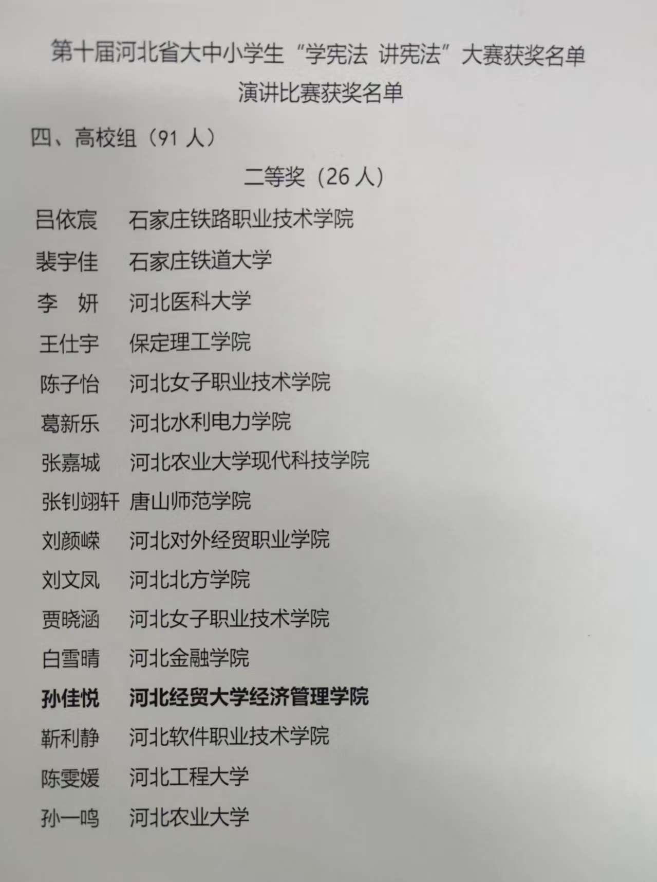 近日,第十届河北省大中小学生“学宪法•讲宪法”大赛落下帷幕。经过激烈角逐,taptap点点文法系学生黄祺茗、孙佳悦分获高校组素养竞赛、演讲比赛二等奖,张丽媛老师获优秀指导教师奖。