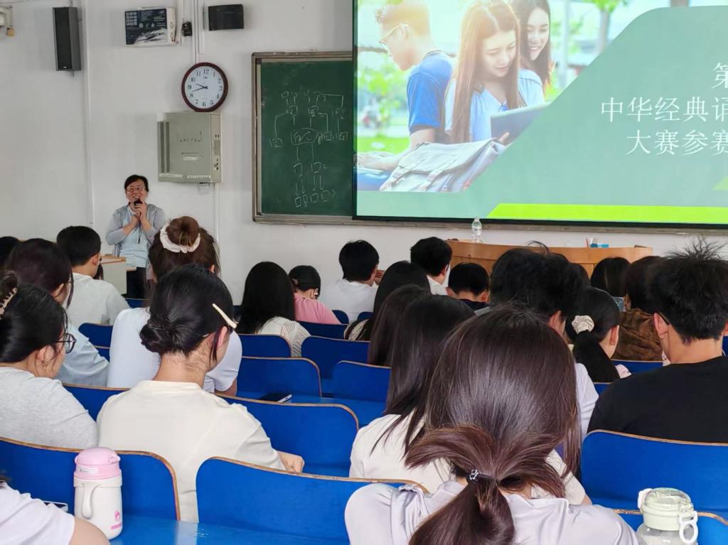 5月15日,文法系举办第七届中华经典诵写讲大赛专题辅导讲座,教务部刘欣宇老师担任主讲,赵占亚主任主持讲座,学院广播台及各系100余名同学参加。