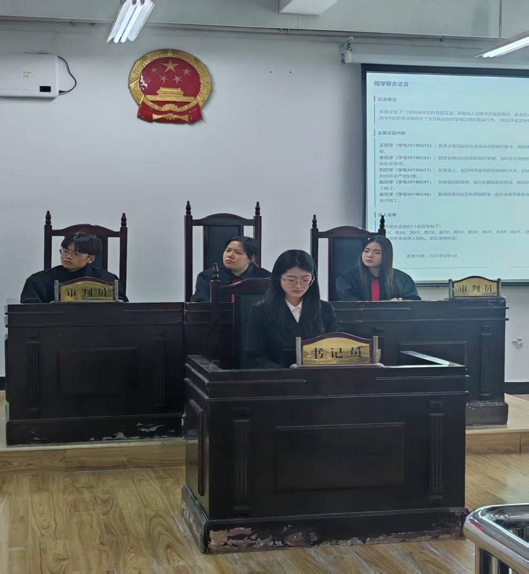 此次模拟开庭以沉浸式体验让参与者深入了解司法程序,既普及了正当防卫、校园安全等法律知识,也强化了青少年对校园霸凌危害的认知,为推进校园法治教育、构建平安校园提供了有力实践支撑。未来,文法系将持续以法学实践教学为抓手,推动同学们从“课堂学习者”向“实务参与者”转变,实现法学专业素养与实践能力的双向提升,为培养高素质法律人才奠定坚实基础。