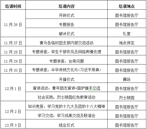 4.学习结束后,各临时团支部整理有关笔记、视频、照片等资料,汇总后于12月1日前发送到指定邮箱。每位学员认真书写不少于800字的学习心得,在结业仪式上进行展示。