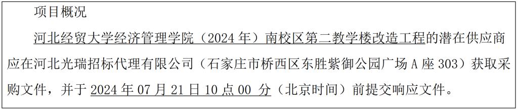投标文件递交的截止时间(投标截止时间,下同)为2024年07月21日10点00 分(北京时间) ,地点为河北光瑞招标代理有限公司(石家庄市桥西区东胜紫御公园广场A座303)。