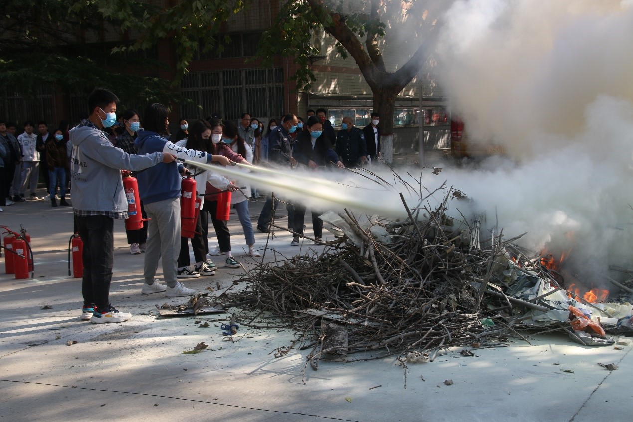 演练开始前,安全工作部李树立为同学们现场讲解了灭火器的使用方法、灭火流程及注意事项,并由后勤保障部人员配合示范。同时还就宿舍用电安全及可能出现的安全隐患给予提醒。听了工作人员的示范和讲解,学生们跃跃欲试,纷纷拿起灭火器,按照标准动作分组进行灭火演练。