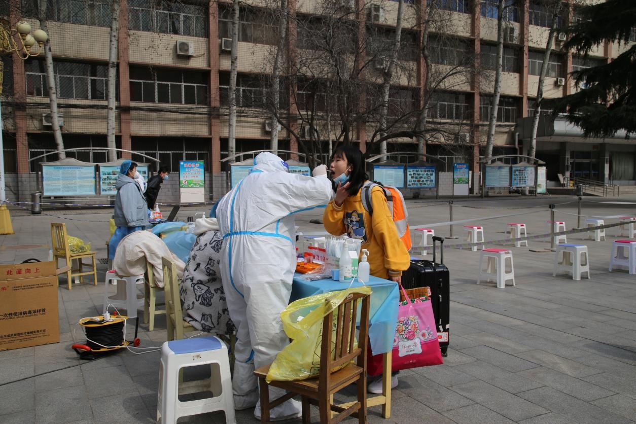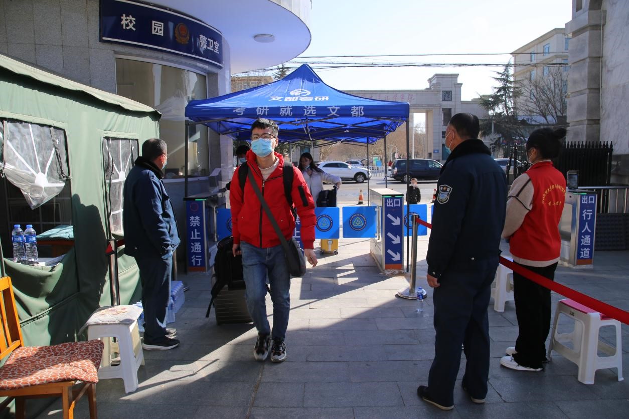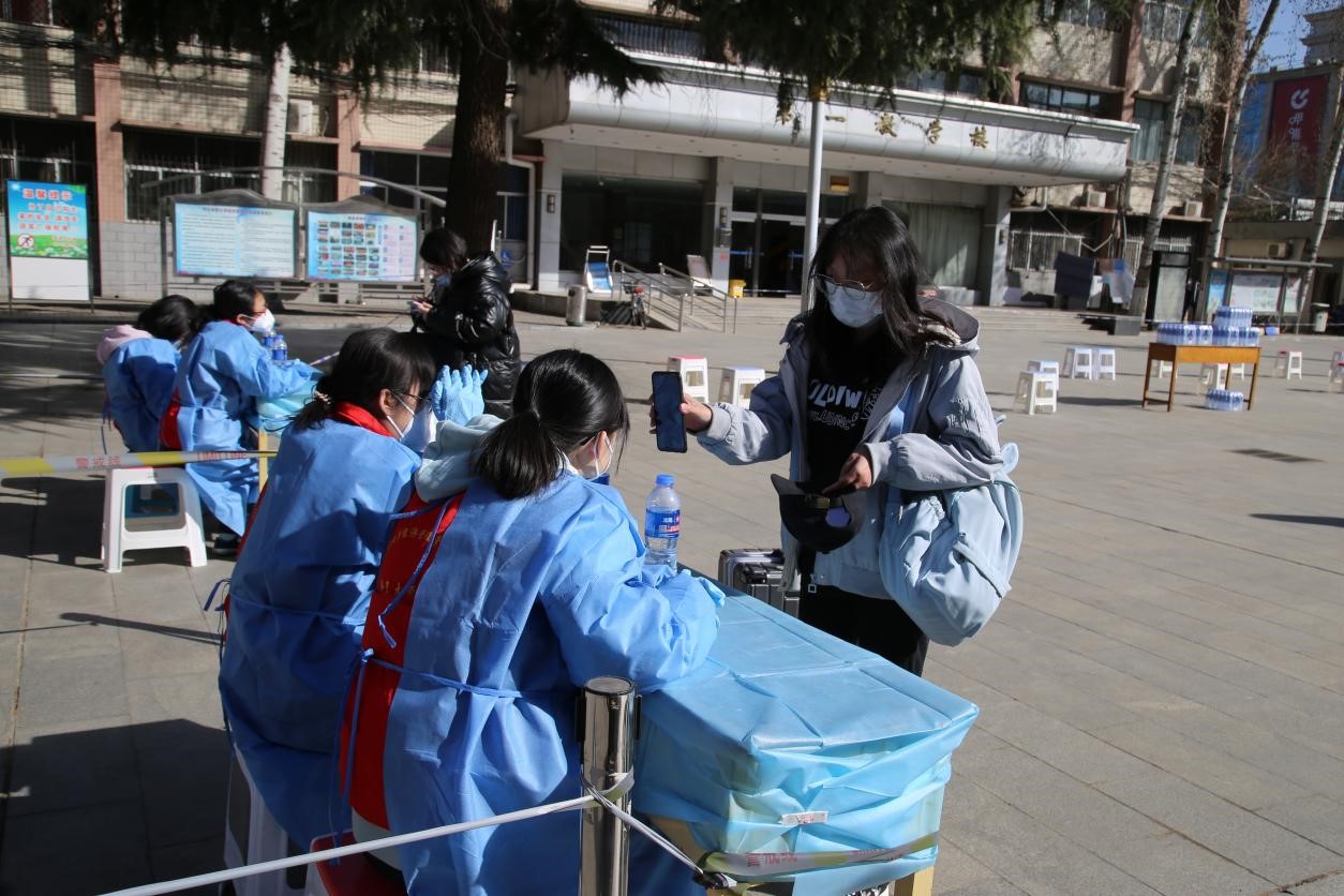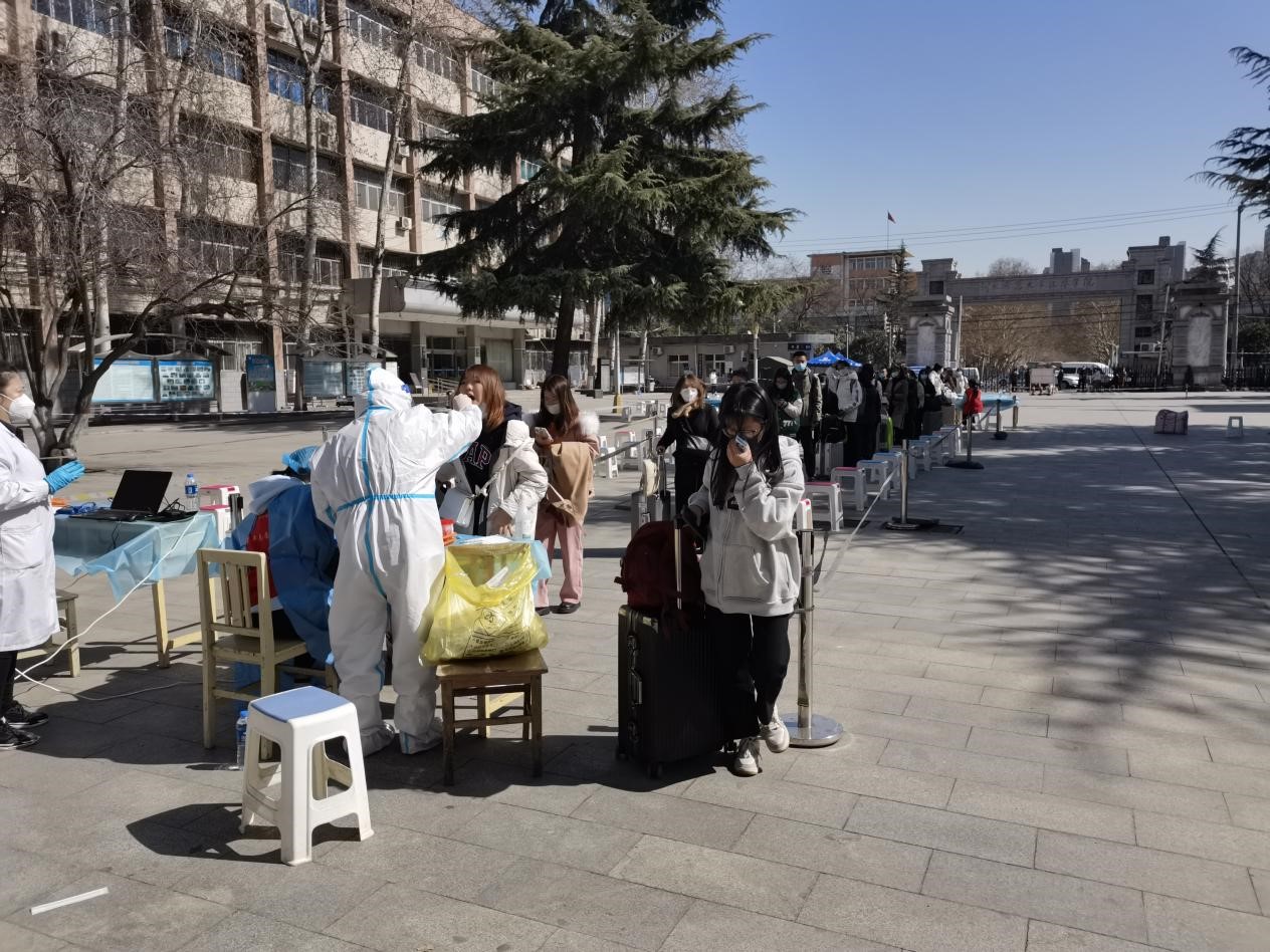 5日一大早,学院领导,各系及相关部门负责人就来到校园,实地查看学生返校情况,迎接返校学生。上午9点钟学生们陆续返校,在刷脸进门,接受志愿者查验核酸检测阴性报告、健康码及行程码,测量体温,进行核酸检测,完成一系列的流程后,学生才能进入宿舍。