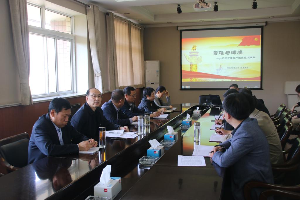 会上邀请河北经贸大学马克思主义学院教授郭建做了题为《苦难与辉煌——庆祝中国共产党诞辰100周年》的专题讲座。讲座从背景、内容、要求、目的和意义等五个方面,对党史学习教育的开展进行了全面阐释,并对“学史明理、学史增信、学史崇德、学史力行”四项目标的具体内容和现实意义进行了详细解读。